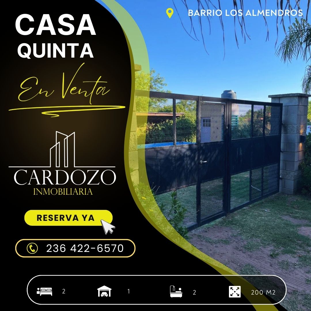 Mirá ésta propiedad en venta en Barrio Los Almendros ! Calle Alsina 1816 – Esquina Neuquén Esta casa quinta combina comodidad, versatilidad y calidad de vida, todo en un entorno tranquilo y con excelente acceso. Terreno amplio de 800 m2 (23,5 x 34,5 mts) 135,5 m² cubiertos + 60,8 m² semicubiertos Jardín frontal encantador ideal para relajarte o recibir visitas Quincho perfecto para reuniones familiares o con amigos Salón independiente tipo yoga / taller / home studio – ¡creá tu propio espacio de bienestar o emprendimiento! Interior pensado para vivir cómodamente: Living con cocina comedor integrados 2 habitaciones luminosas 2 baños: uno dentro de la casa y otro exterior (ideal para reuniones al aire libre) Cochera Servicios de agua y luz conectados. Gas pasa por la esquina (fácil conexión) Se acepta permuta